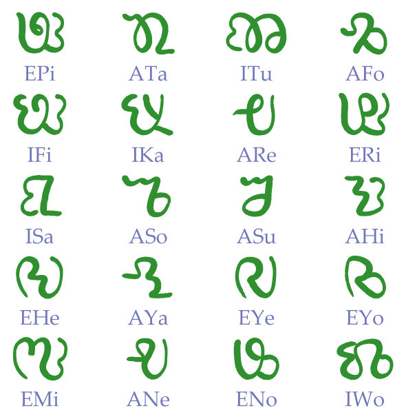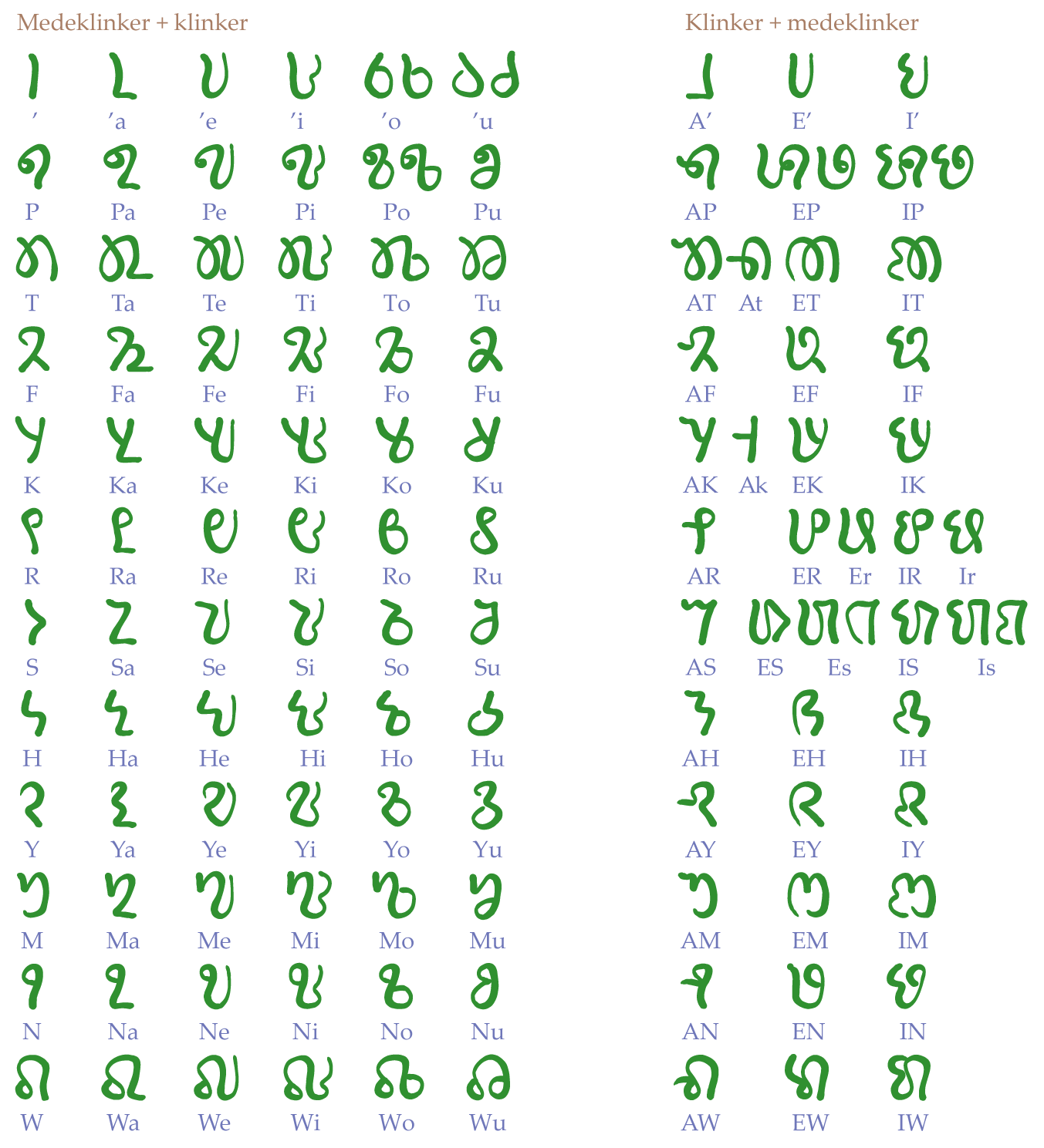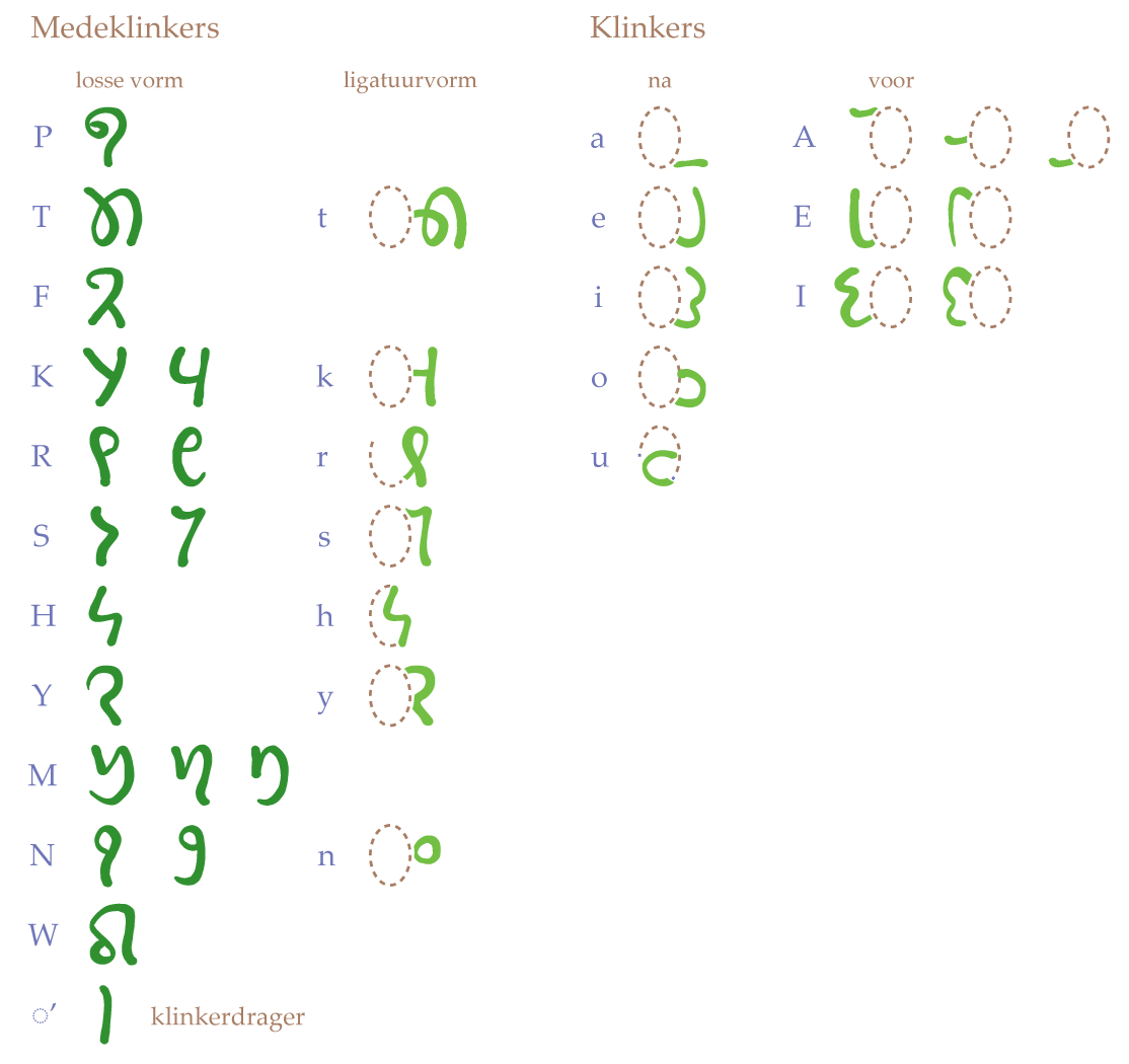 De basisletters zijn: elf medeklinkertekens (ptfkrshymnw), vijf klinkertekens (aeiou) en een klinkerdrager (grofweg een verticale streep, in transliteratie weergegeven met een apostrof ’).