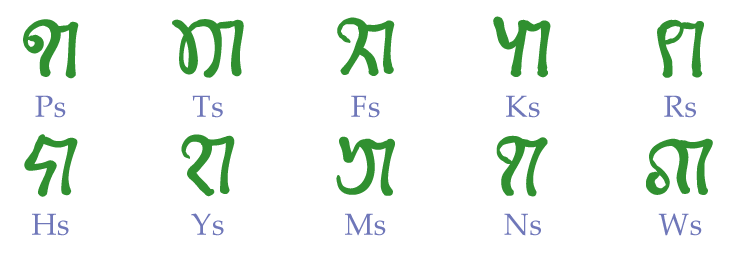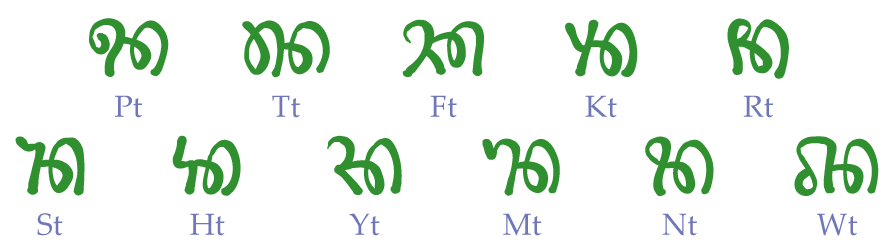 Zoals hierboven gemeld kunnen medeklinkertekens altijd in losse vorm staan en hoeven ze dus nooit te ligaturiseren, maar een aantal ervan kán het wel als de schrijver daar pret in schept. Het betreft de t, k, r, s, h, y en n: die mogen versmelten met hun linker buurletter (medeklinker, soms ook klinker) en veranderen daarbij in meer of mindere mate van vorm: