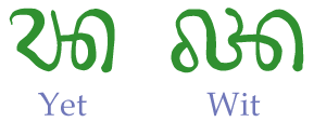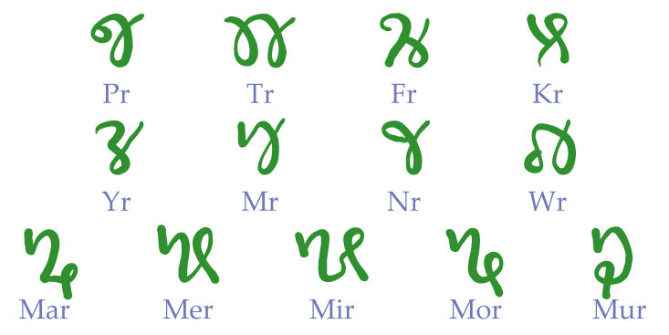 Een medeklinkerteken kan ook aan beide kanten van een klinkerteken worden voorzien; dan krijg je drieletterligaturen als de volgende:
