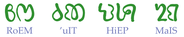 In de afbeeldingen gebruik ik voor de transliteratie van Tiukû-tekens (weergegeven in lila tekst) een speciale notatieconventie met hoofd- en kleine letters. Die geeft voor de medeklinkers aan of ze in losse vorm (hoofdletter) of verbonden vorm (kleine letter) staan, en voor de klinkers of ze ná (hoofdletter) of vóór (kleine letter) een ander teken komen. Voor het lezen van een tekst doet deze notatie er verder niet toe, noch het gebruik van de apostrof: of er nu ReIs, Re’iS, ReiS, ReIS of RE’Is staat, allemaal worden ze gelezen als reis.