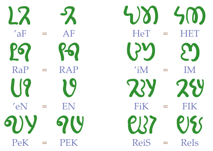 Let op het atypische ophaaltje links bovenaan de Sh: dat is om deze ligatuur te onderscheiden van de AH, die er anders precies hetzelfde uit zou zien (zie onder Medeklinkers en klinkers hierboven).