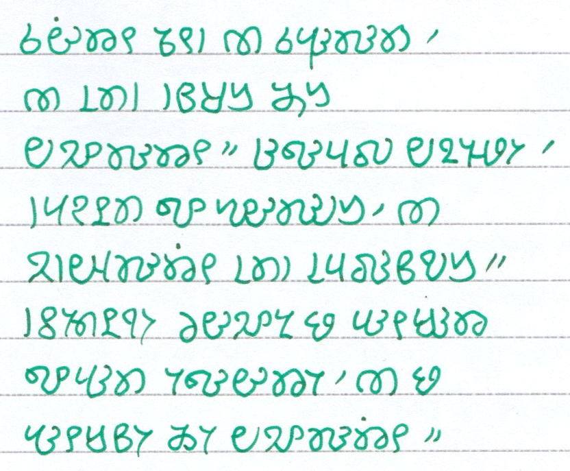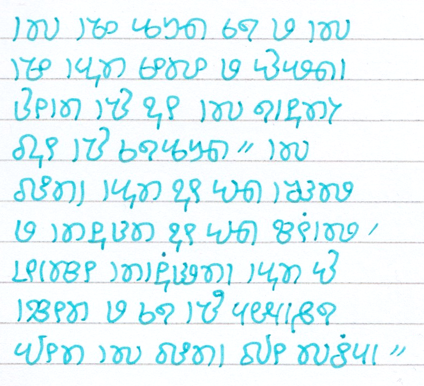Deze is dan ook in weinig opzichten origineel en overduidelijk bij elkaar geleentjebuurd uit windstreken als Ethiopitrea, Malayalamland en Runistan, maar met een resultaat dat me voldoende prettig uit de pen vloeit om ermee verder te knutselen. Het schrift heet voorlopig Tiukû, wat Ahâpînik is voor 23-5-30, want toen begon ik het te bedenken.