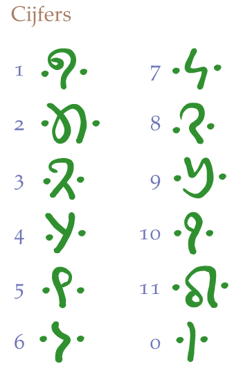 Cijfers hebben geen speciale tekens maar worden uitgedrukt met de elf medeklinkers en de klinkerdrager, tussen twee halfhoge puntjes geplaatst.