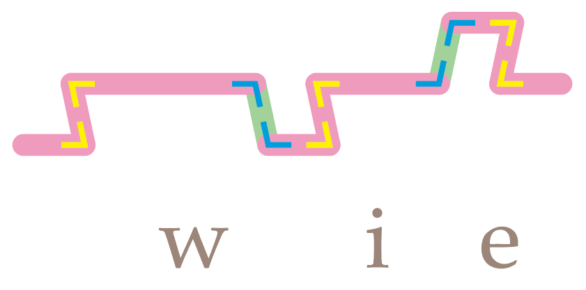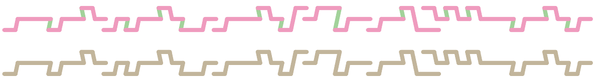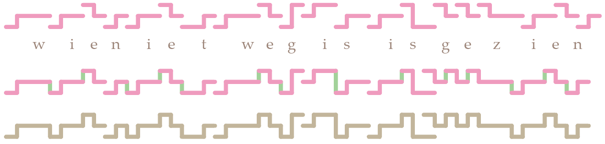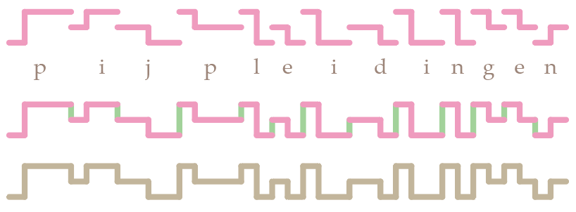 Zo snappen we waarom de letters in bijvoorbeeld pijpleidingen niet overal dezelfde vorm hebben. De i bijvoorbeeld heeft weliswaar telkens de code -1+2, maar bij de eerste i wordt die gerekend vanaf de bovenlijn (want daar eindigt de p links ervan); bij de de tweede i moeten we rekenen vanaf de onderlijn (vanwege zijn linkerbuurman e) en idem evenzo voor de derde i (aangezien de d daar eindigt):