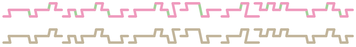 Goed gezien, lezer! Dat komt namelijk omdat de letters geen vastgelegde vorm hebben, maar worden gedefinieerd in termen van stijgen en dalen van de traptreetjes ten opzichte van hun buurtreetjes. Triptrap is een voorbeeld van wat ik een relatief schriftsysteem noem (ik heb er meer, zoals Wirwar en XOR en Relatieve kleurcode): letters hebben een vaste onderliggende beschrijving, maar hoe die zich precies tot concrete vormen manifesteert hangt af van de context.