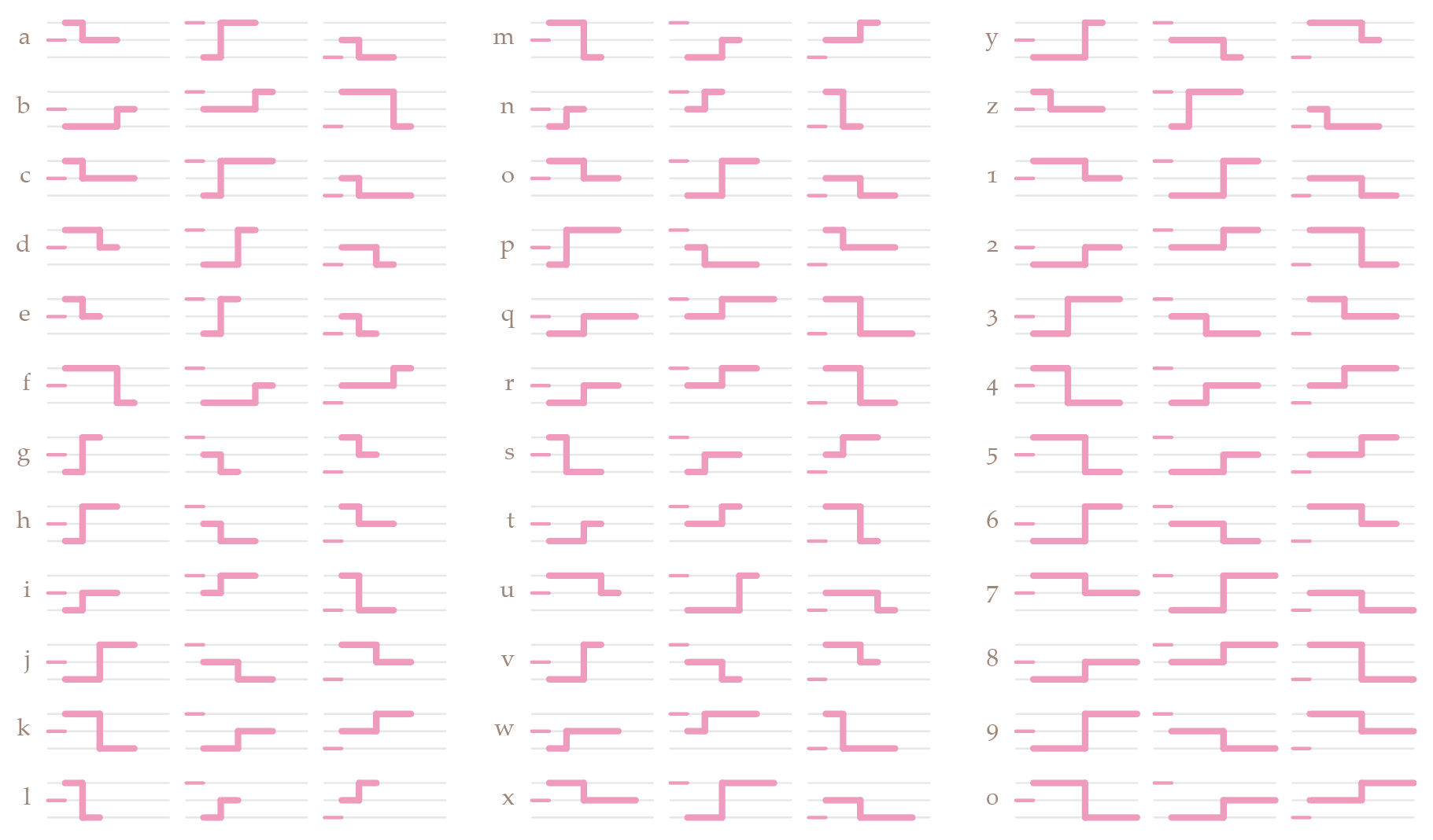 En zo gaat het met alle letters. Een letter heeft altijd dezelfde onderliggende code, maar hoe die exact vorm krijgt wordt bepaald door de letter die eraan voorafgaat. De codes voor het hele alfabet (plus cijfers) zijn als volgt: