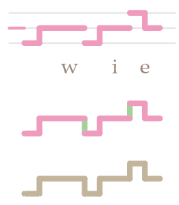 Twee van de mogelijke vormen die een letter kan krijgen lijken erg op elkaar en verschillen alleen in de hoogte waarop ze staan, plus een derde vormpje dat er heel anders uitziet omdat het een ‘dimensie’-sprong maakt van boven- naar onderlijn of vice versa. Maar de breedtes van de twee treden zijn voor alle drie de vormvarianten van een letter altijd dezelfde.