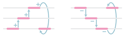 Daarom geldt in zulke gevallen: ten opzichte van de bovenlijn betekent het plusje “ga naar de onderlijn” en ten opzichte van de onderlijn betekent het minnetje “ga naar de bovenlijn”. Alsof de + en – zich zegmaar via de derde dimensie om de regel heen wikkelen: