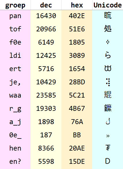 Wat je nu hebt is een omzettabel waarin je in de lettergroepjeskolom (roze) kunt zoeken naar lettergroepjes en in de Unicodetekenskolom (blauw) naar de corresponderende Unicodetekens. De dec- en hex-kolommen heb je niet specifiek nodig, maar ze kunnen steun bieden.